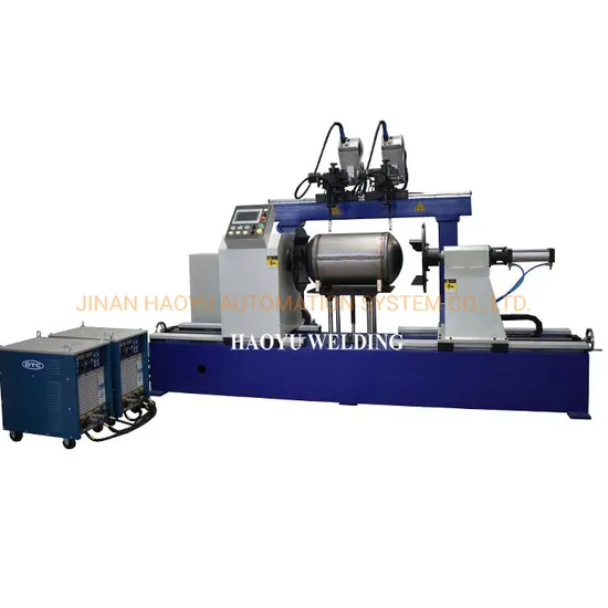 Automatic Welding Machine Specification Automatic welding machine can weld stainless steel and carbon steel water heater. Welding torch is fixed while workpiece rotating. Welding position is horizontal. The workpiece is clamped tightly by fixture at two ends and rotates. Two welding torches and two power sources work simultaneously to improve work efficiency. PLC is adopted to control the machine to run and speed is adjusted by AC servo, which can improve the reliability of the equipment. Adopts end face positioning and pneumatically clamping mode. Human-machine interface to alter the parameters. The welding time and weld length can be set via the interface. The alteration of the parameters can be input through the touch button conveniently and timely. Parameters can be stored and called. Automatic dust-extraction device to purify the environment.