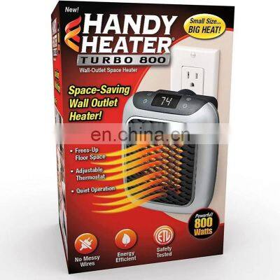 Handy Heater Turbo 800 Wall-Outlet Space HeaterHandy Heater Turbo 800 Wall-Outlet Space Heater picture Product Description Detail picture of Handy Heater Turbo 800 Wall-Outlet Space Heater Packaging & ShippingPacking details of Handy Heater Turbo 800 Wall-Outlet Space Heater1pc/colour box,40pcs/ctn,56*27.5*61cm,17/16kgsOur Services 1) Your inquiry will be replied within 12 hours.2) Well-trained & experienced sales can reply your inquiries in English.3) Working time: 8:30 am ~6:00 pm, Monday to Friday (UTC+8).During working time, E-mail will be replied toyou within 2 hours4) OEM & ODM projects are highly welcomed. We have strong R&D team.5) The order will be produced exactly according to order details and proofed samples. Our QC will submitinspection report before shipment. 6) Your business relationship with us will be confidential to any third party.7) Good after-sale service. Company Information Ningbo Pinbo Plastic Manufacturer is one of most competitive supplier specializes in promotional giftitems, was established in 2006. With more than 160 persons and many modern facilities, currently, wehave already exported to America, Europe, Japan, Mexico and 20 other countries and regions. Your OEMand ODM product are welcome, our 6 experienced engineers and designers can work on your ideas. Weregards “high quality, competitive price, on-time delivery, and fast and effective communications” as ourtenet, hope to cooperate with more customers for mutual development and benefits. FAQ 1)Mix colour can be choosen2) Our partners: