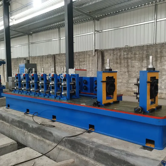 The high frequency straight seam welded pipe mill is used to level the fixed strip after slitting line, and entry it to forming machine, bend to open pipe by rollers, melt the strip edges through the high frequency current,squeeze and weld the pipe to be closed by the squeeze roll. The high frequency pipe mill also called ERW pipe mill.
