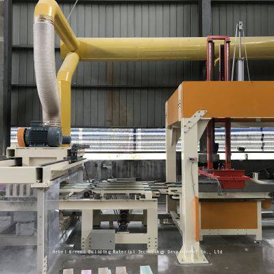 Process action descriptionThe entire stack of gypsum boards is placed on the storage conveyor by a forklift. The suction type automatic board feeding machine sucks a single gypsum board onto a positioning conveyor, and then the gluing machine starts gluing (according to the length direction of the board). The glue applicator is equipped with 5 glue nozzles, and the top board of each group stack is not gluing. After the gluing is completed, a group of boards is fed into the saw blade host through a servo feed device for cutting.After cutting the finished gypsum strip 1200 * 100, buffer 10 finished gypsum strips on the sawing belt conveyor, and then grab them by the manipulator and stack them on the finished product stack, and stack them at 90 degrees crossing for each layer. After stacking on a certain number of layers, the conveyor is transported to the forklift position, and the forklift forks it away.