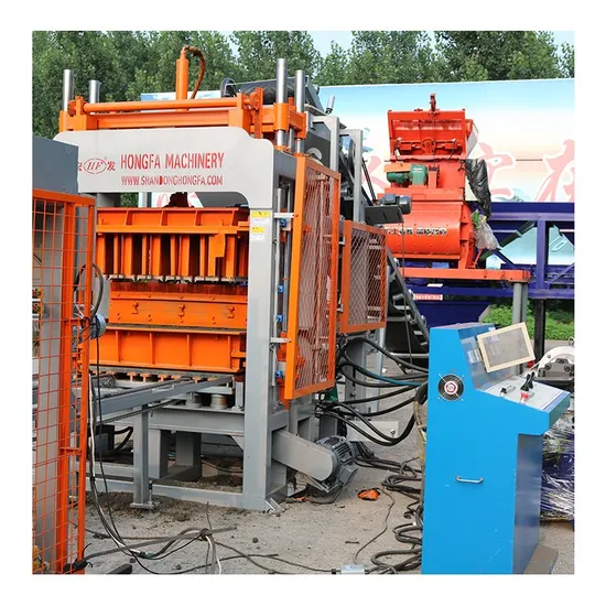 1.Advantages& Main Technical Parameter QT5---15 block machine is Hongfa's patented brick machine, best seller in Africa,perfect in manufacturing 1 meter length curbstone with competitive price and stable performance.It adopts four-lead ,channel steel stander making the equipment more firm and the mould and the squeeze head Orentation more precise ,and bed mould orientation vertical vibration and upper mould compression vibration ,which improves the efficiency greatly and manufactures blocks with more average density and higher strength.The machine adopts PLC control, and realizes automatic pallets-supplying, material-distributing, and brick-discharging.with the high production efficiency.