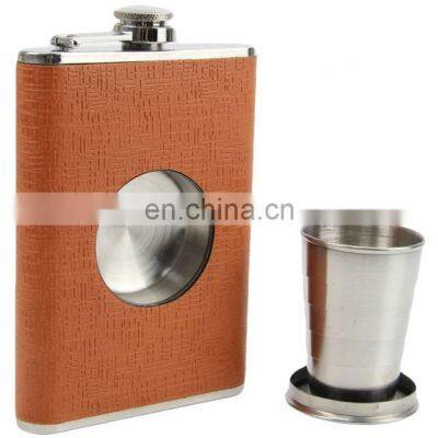 You May LikeProduct Information•Material:Classic standard 8 oz Hip Flask with collapsible shot glass included. The hip flask and the funnel are made of high quality 304 (18/8) food grade stainless steel. Rust and corrosion resistant and leak,fall apart,natural Environmental protection Will not disappoint you.•Capacity:The stainless steel hip flask can hold up to 8 oz.It is a perfect trendy flask for self use or when enjoying happy time with friends.•Style:This men's 8-ounce hip flask has a shot glass, brown PU leather, leather exterior to ensure non-slip grip. A screw top cover with holder so it can't be lost.•Perfect gift: This is a perfect gift for a perfect gift for weddings, birthdays, parties, camping, fishing, boating, etc. Product TypeLeather stainless steel hip flask Material304 Stainless steel Size9.6 X 2.6 X 14.6 cm ColorSilver + brown leatherCapacity:8 ozPacking:1pc/ Neutral Color BoxOur Advantages: 1. Good quality product with reasonable price 2. Fast response to all your questions 3. Low MOQ, Customization welcome 4. Fast DeliveryCompany ProfileOur ServiceExpress Delivery by FedEx, DHL, TNT, UPS, EMS Shipment Weight1 - 45 kg45 - 200 kgor MoreMode of ShipmentBy CourierBy Courier / AirBy Air / SeaLead Time5 - 7 days5 - 7 days5 - 7 days30 days to Europe / USADoor to door delivery carrier includes: DHL, Fedex, UPS, TNT, EMS etc.A full range of sea and air logistics to provide you with the most convenientlogistics experience, rapid response to save your time.Payment TermsTrade AssurancePayPal / Secured PaymentWestern UnionBank TransferFor any amount< $ 5000For any amountFor any amountFrequently Asked QuestionsQ: Why choose us?• Lowest factory price with good quality• Low Minimum Order Quantity • Free sample to check quality• We also accept trade assurance order to protect buyerQ: What kind of method do you use to put customized logo?• Silk screen printing • Laser engraving • Etching• Stamping• Embossing / Debossing and any other mode you wantQ: How to save sample cost?• Stocked item, no MOQ. Small batch production also welcomedQ: How to get a sample?• We can supply free sample of standard product, you just need to bear the shipping cost.• For customized sample, please contact us for sample cost.Q: What is sample time and production?• Existing sample: 2-3 days• Customized sample: 7-10 days• Mass Production Time: 25-30 daysQ: What is your shipment term?• We can send your shipment by Sea / Air / Door to door courier, depends on the shipment size we can give you suggestions.• As we are sending shipments frequently by courier , we are getting good discount from the carrier, and we will transfer the benefit to you.Q: What is your term of payment?• We are quite flexible about payment, we accept T/T, PayPal, Western Union, Trade Assurance, etc.Contact DetailsPhone Number0086-512-68080479 (Ext No.602)Email Idsales@esunrix.comWhatsApp+86 13606131434Skypesunrise-sales3WeChatesunrix