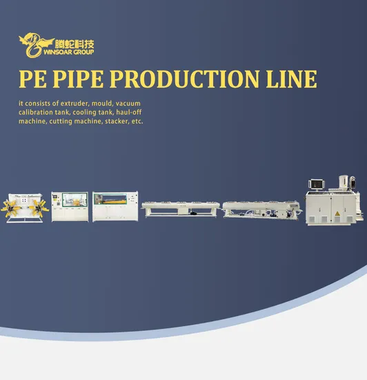PE Plastic Pipe Extrusion Line is mainly used in the production of agricultural drainage, water supply and cable conduit purposes. The unit consists of single extruder machine, mold, vacuum forming tank, multi-claw haul-off machine, planetary(chipless/non-dust cutter) cutting machine, stacker and so on. And the line can be equipped with Comptroller thickening instrument or computer ink-jet/laser printer, etc. to achieve the production and manufacture of high-grade tubing.