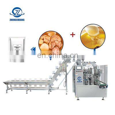 Bowl Conveyor Feeding Ready to Eat Food Simmer Sauce Envasadora Doypack Automatic Rotary Retort Pouch Packing MachineProduct ParamentersItem NO.ZC-W200/250DimensionsL4000mm×W2000mm×H2100mmPacking Speed16-60 Bags/min (depending on products character and filling volume)Packing Bag SizeL: 100-350mmW : 60-200mm/80-250mmWeight1800KGAir Compressed air consemed≤0.6m³ / minAccuracy±1g (≤100g) / ± 1%( >100g) according to materialApplicationSuitable for liquid or semifluid products packing, such as beverages, juice, ketchup, bechamel etc.Working Procedure1.Bag feeding2.Coding3.Opening4.Filling A5.Filling B6.Heat sealing A7.Heat sealing B8.Forming and outputDescription1.According to customer demand for customized, to recommend the appropriate products to customers.2.Storage racks devices which can Satisfy the products short stop ,which can keep the production line work continuously.3.Good service,If you have any questions, you can communicate by telephone video.Recommend ProductsProducts DescriptionCompany ProfileFAQTrade patterns 1. Lead time: 15-20 working days after receive deposit2. MOQ: 1 set.3.30% deposit+ balance payment before delivery by T/T, western union, cash.4. Loading Port: Shantou or Shenzhen Port Export Process 1. We will prepare goods after receive deposit 2. We will send goods to your warehouse or shipping company in China.3. We will give you tracking number or Bill of loading when your goods is on the way 4. Finally your goods will arrive your address or shipping port Frequently Asked Questions Q: First time import, how can I believe that you would send products? A: We are verified company by Alibaba to make transaction success, we support and recommend you to pay money to us by Alibaba Trade Assurance.Q: How about the quality of your product?A: Our products manufactured strictly according to national and international standard-- We have ISO certification-- We take a test on every product before delivery.Q: How to choose the machine type for our bags? A: Pls support us the following information about the bag and the food. 1) Bag pattern (Bag samples or pictures would be appreciated.)2) Bag size 3) The filling weight or volume 4) Material of food: powder/liquid/paste/granular/massiveness Q: What aftersales service or any question about products?A: This machine enjoys 1 year warranty