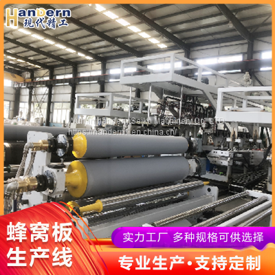 This production line adopts the extrusion method of one molding process, PP as the main raw material, the production of three-layer sandwich plate, two sides of the thin surface layer, the middle of the honeycomb structure can be layered single-layer plate, double-layer plate. PP honeycomb board can also be formed once double-sided cloth, film, has the advantages of light weight, good stiffness, environmental protection, cold resistance, sound insulation, moisture insulation and so on.