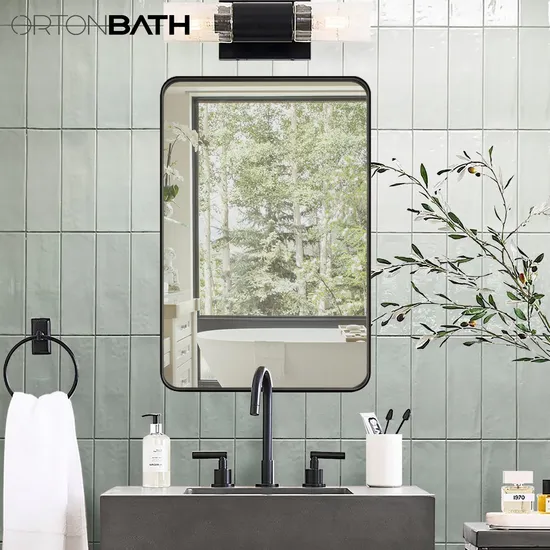 ORTONBATH round corner rectangular Wall mounted hanging Mirror for Bathroom with brushed Black Metal Vanity Mirror for Bathroom Detailed Photos
