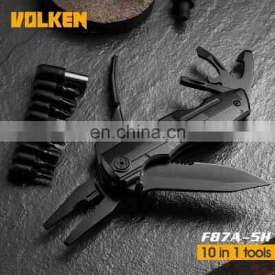 10-IN-1 Multi-Function Tool Product Name: Multi-Function Pliers Item NO.: F87A-5H Closed Size: 110mm Open Size: 190mm Colour: Any color availableSample Time: 7 DaysDelivery Time: 55 Days FUNCTIONS 1.Long Nose Pliers2.Pliers 3.Wire Cutter4.Knife Blade(lock)5.Bottle Opener6.Large Flat Screwdrive7.Can Opener8.Small head Screwdriver9.Bit Switch10.9-in1 Batch fittings set FAQ Q: Are you a factory or trading company?A:We are a factory located in Guangdong China with 25 years manufacturing experience. We are very welcome you to visit us at a convenient time. Q: Can we order in small qty.?A: Yes. You can order small qty. online directly. Q: Can I change material or steel for my knives?A:Sure, allblade material can be customized according to your request. We can change knive steel as 420, 440C, D2, VG10, S35VN, etc. Q: Can you do the design for us?A: Yes. We have a professional team to design for you. You Just need to tell us yor idea and we will help to carry out your idea. Q: What about the lead time for mass production?A: Usually it would be 30-40 days base on general orser. Q: How does your factory carry out quality control?A: Quality is our priority. Our QC always attach great importance to quality control from the very beginning to the end of the production.Each product will be fully assembled and carefully tested before