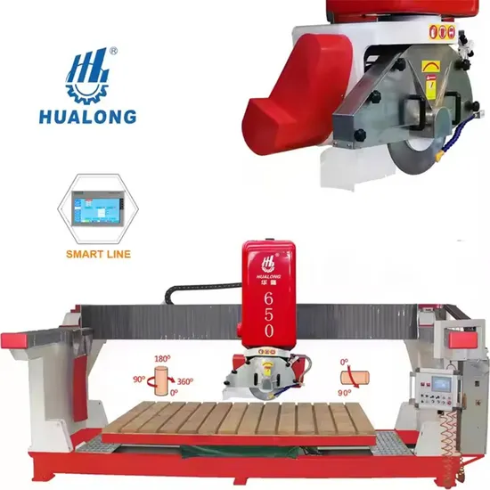 Full Automatic Bridge Stone Cutting Machine HLSQ-650 with function of 0°-90°-180°-270° full automatic positioning, chamfering and cutting, is suitable for processing stone slab cut to size, tombstone, skirtboard etc.