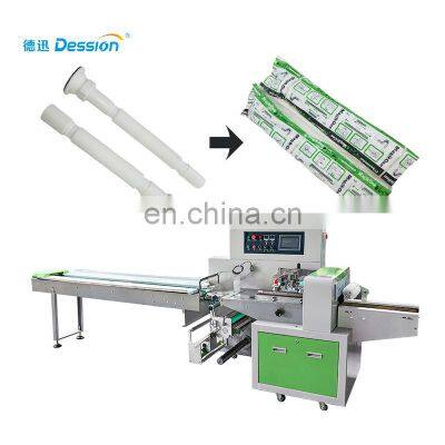 Plastic bag gel tube pillow packaging machine rubber tubes packing machineMachine IntroductionPackaging ApplicationAutomatic flow packing machine is a widely used packing machine. Suitable for all kinds of product packaging. Including medicalsupplies, vegetables and meat, baked bread, snacks and candy, daily necessities, hardware accessories, etc.Packing EffectThe effect after packaging is back-seal bag. According to demand, other devices can be customized or upgraded to meet other models. For example, pillow bag with hole, bag with label, gusset bag, etc.Machine Structure and ParametersMachine Characteristics1. Double frequency conversion control, the bag length canbe set and cut, no need to adjust the air, one step in place, saving time and film.2. Man-machine interface, parameter setting is convenient and quick.3. Fault self-recognize function, fault display at a glance.4. High-sensitivity photoelectric eye color tracking, digital input sealing position, make sealing position more accurate.5. Temperature independent PID control, better suitable for various packaging materials.6. Positioning stop function, no sticky kuife, no waste film.7. The transmission system is simple, the work is more reliable, and maintenance is more convenient.8. All control is implemented by software, which is convenient for function adjustment and technical upgrade, and never lags behind.ModelDS-250XDS-350XDS-450XDS-600XDS-700XDS-800XFilm Width(mm)Max.250Max.350Max.450Max.600Max.700Max.800Bag Length(mm)45~33065~330120~450130~450120~600120~600Bag width(mm)30~11050~16060~21060~28050~33050~380Products Height(mm)Max.70Max.80Max.110Max.150Max.150Packing Speed(bag/min)40~23030~15030~15020~12030~150Machine Power220V / 380V, 50/60HZ,2.4KWMachine Size(L*W*H, mm)3920*670*13204020*720*14503900*900*14683990*1000*14684400*1100*14604400*1200*1460Machine Weight800KG900KG900KG1050KG1050KG1050KGDetails ImagesMachine WorkflowThis machine is easy to operate. Just set the parameters on the screen, and then you can start the machine. Put the product on the conveyor belt, the machine will automatically pull the film, the bag is formed, sealed, and finally the bag is cut.Multilingual touch screenThe machine supports various language customization, easy to operate.High sensitivity eye sensorThe eye sensor automatically senses the color code to ensure accurate and beautiful packaging effects.Replaceable bag formerWhen you want to change the bag width, you only need to change a different size bag fromer.Electronic control componentUse Panasonic PLC and frequency converter to ensure the stable operation of the machine.Related ProductsWhy Choose UsVR1. Professional and Strong TeamDession has a professional team that can provide customers with various packaging solutions. After fully understanding the customer's needs, we provide the most suitable packaging solution to the customer. Then start the production of the machine. We have a strong production and processing capacity, from the customized processing of accessories to the assembly and debugging ofthe machine. Finally, it is packaged and shipped, and it only takes a week to complete.2. Excellent transportation serviceAccording to the needs of customers, we can provide sea transportation, air transportation, and land transportation services, so that you can get the machine as soon as possible. Provide door-to-door transportation services.3. Timely and effective after-sales serviceChoosing us is not only buying a machine, but also our professional and timely service. 1. When the machine is delivered, we will attach a video of the installation and operation of the machine, so that you can use the machine quickly. 2. All electrical appliances of our machines have a one-year warranty, and we will replace them if they fail. 3. When your machine fails, we will have professional engineers to provide professional online after-sales service to help you solve the problem. 4. If the problem cannot be solved online, we will arrange an engineer to repair it on site within a week.Buyer FeedbackWe have 8 years of experience in foreign trade and export, and now our customers have spread to 90 countries all over the world. With our high-quality machines and professional services, we have won unanimous praise from our customers.Company Profile Dession a leading manufacturer of Packaging machine and supporting facilities, which has successfully developed more than 80 kinds of packaging machines. Dession Packaging Machine has widely applied for different fields throughout the world, such as food/ industrial food, medicines, hotel supplies, disposable goods, rubber goods, daily appliances, hardware fittings, sporting goods, toys etc. Dession has more than 8000 square meters of production plants, 5 production workshops and a parts processing workshop, including small vertical machine production workshops, vertical machine production workshops, pillow machine production workshops, cartoning machine production workshop and filling machine production workshop.FAQQ1:Do you have manual or operation video for us to know more about the machine? Yes, not only manual or operation video, 3D drawing also available to make as per your design,also the video we can make of testing the material from our packaging machine if your packing goods easier for us to find from our local market. Q2:How can I trust you for the first time business ?Please note our above business license and certificate. And if you don't trust us, then we can use Alibaba trade assurance service, guarantee your money, and guarantee your machine's on-time delivery and machine quality.Q3:Is engineer available to serve oversea?Yes, but the travel fee is paid by you. So actually to save your cost, we will send you a video of full details machine installation and assist you till the end.Q4:How can we make sure about the machine quality after we put the order?Before delivery, we will send you the pictures and videos for you to check the quality, and also 