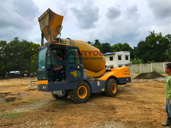 Self-loading concrete mixer is equipped with a powerful engine and 4 wheel steering, the self loading concrete mixer is easy to operate and go everywhere needed.It's the combination of concrete mixer truck and cement mixer, which can automatically feed, measure, mix and discharge concrete mixture.