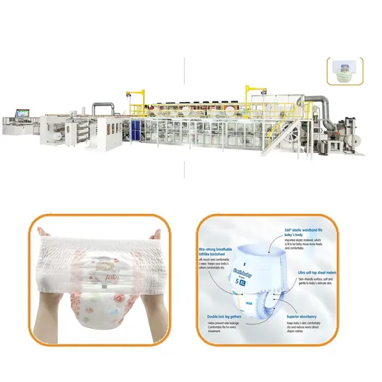 The baby's skin is more delicate than that of adults, and the quality of the raw materials as well as the rationality of the diaper's product structure are very high. The use of high-quality raw materials and reasonable product structure of this full servo H-shape pull up baby diaper machine production line can take care of the baby's delicate skin and keep it comfortable and dry all day long. The product structure upper&lower tissue (or airlaid), cotton core(mixed with SAP), ADL, PE film, Front tape, Topsheet hydrophilic Leg cuff hydrophobic nonwoven, "S" cut side, Waistband online. It is capable of producing four sizes of baby diapers (M/L/XL/XXL) and can also be customized to produce various types of baby diapers using a convenient and quick full servo drive digital number change system, according to the customer's product size design.
