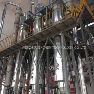 Triple-effect evaporating crystallizer consists of Effect I/II/III heating chambers, Effect I/II/III separating chamber (crystallizer), forced circulating pumps, material delivery pumps, vacuum pump, operation platsform and electrical control system.