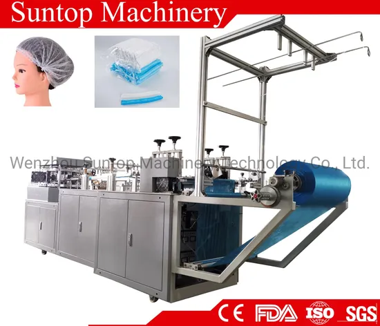 Bouffant Cap Machine Medical Nursing Cap PE Head Cover Non-Woven PP Mop Cap Strip Shower Cap Disposable Cap Making Machine. It adopts ultrasonic heat sealing method, frequency conversion speed regulation, and produces non-woven materials and plastic film materials. The disposable dust-proof non-woven strip caps are integrated into the finished product from feeding to finished products. You just feeding the material (Non-woven or PE Plastic film and rubber band ),then you will get final product.