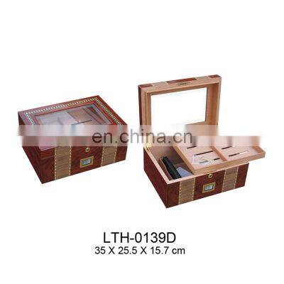 Product DescriptionMaterial: Wooden / MDFColor: real wood veneer inlay or CustomizedCapacity: 100CT cigars or customizedAccessories: gold –plated hinges, 1 internal hygrometer, 1 big humidifier Features:custom display cigar humidor wholesale humidor1.high gloss finish, lining cedar veneer inside2.Scratch resistant felt lined bottom3.1Humidifier, 1Hygrometer4. LeadtimeQuantity(Pieces)1 - 5051 - 100101 - 10000>10000Est. Time(days)455060To be negotiated Packaging & ShippingProduct size: 35*25.5*15.7CMPacking:2pcs per contonCarton sizxe45*32*43CMNet weight/gross weight:7.5/9.2KGS Our Services OEM&ODM service are offered.Company Information LONTEN craft products factory was set up in 2000 year, with more than twenty years of experience in dealing with the wooden boxes . Our products come in wide range, the main products being Cigar humidors, Cigar cutters, Cigar ashtrays,Cigar cases,Punchers, Jewelry/Watch boxes,Wine boxes, CD boxes and other wooden gift items. All these are completed with outstanding craftsmanship and quality assurance, available at attractive price.Certifications FAQ Q: When can I get the price?A: We usually quote within 24 hours after we get your inquiry. If you are very urgent to get the price, please call us or tell us in your email so that we will regard your inquiry priority.Q: How can I get a sample to check your quality?A: After price confirmation, you can require for samples to check our quality.If you need the samples, we will charge for the sample cost .But the sample cost can be refundable after oreder confirmation when your quantity of the order is more about the MOQ.Q: What kind of files do you accept for printing?A: AI, PDF, CoreDraw, high resolution JPGQ: Can you do the design for us?A: Yes. We have a professional team having rich experience in gift box design and manufacturing. Just tell us your ideas and we will help to carry out your ideas into perfect packaging boxes. It does not matter if you do not have someone to complete files. Send us high resolution images, your Logo and text and tell us how you would like to arrange them. We will send you finished files for confirmation.Q: How long can I expect to get the sample?A: After you pay the sample charge and send us confirmed files, the samples will be ready for delivery in 5-7 days for leather box, 7-10 for wood box. The samples will be sent to you via express and arrive in 3 days.You can use your own express account or prepay us if you do not have an account.Q: What about the lead time for mass production?A: Honestly, it depends on the order quantity and the season you place the order. The lead time of MOQ is about 35 to 45 days. Generally speaking, we suggest that you start inquiry two months before the date you would like to get the products at your country.Q: What is your terms of delivery?A: We accept EXW, FOB, CIF, DDU. You can choose the one which is the most convenient for you.Sample order for checking quality is warmly welcome!