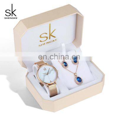 SHENGKE SK Hot Sale Watch Sets Blue Jewelry Necklace Earrings 4 Pieces Quartz Wristwatch Bracelet Watch Gift Girl Friend Buyer Feedback FAQ 1.What is your MOQ (MOQ=Minimum Order Quantity)?If you order our brands (SINOBI / SK) watches which we have in stock, no MOQ limited, you can buy how many you want, and can mix with different models and different colors. 2.Can you provide sample first before I place mass production order?Yes, we can provide samples for your reference, and the sample fee will be returned to you when you order mess bulk products which reaches minimum order quantity 300~500 pieces3.How about your products quality?Our quality had praised so many clients , quality advantage as below :1)All our SINOBI and Shengke (SK) watches are at least 3ATM water resistant, 100% tested by Waterproof Testing Machine.2)All our brands’ watches are vacuum plated,color would last at least 1~2 years.3)For OEM or ODM watches, we will produce the watches as your requirements. It can comply with CE&RoHS, etc. You can arrange your QC team or hire the third party to test the watches before delivery.4.How long is your warranty time?All our Sinobi and Shengke (SK ) brands watches’ is 12 months warranty. 5.What's the delivery time?If take our brand logo watches, the delivery 3~7 days after paymentFor OEM orders, the delivery time is : alloy case watches 20~25 days , stainless steel case watches 45~50 days .6.How about shipping methods?If you have a courier in China, goods can be sent to your courier after payment.If you have no cooperated courier, we will check the shipping details and cost for you after your final order is confirmed.7.What's your payment terms?1)For our stock Sinobi and SK brand watches , payment should be arranged 2~3 days before shipping .2)For OEM or ODM order with brand your own logo, 50% deposit before production, 50% balance before shipping .8.Are you factory or trade company?We are factory (in Guangzhou ,China),welcome to visit our factory, if you are interested in our factory ,please contact us for more details.9.How to place an order?Click below picture to contact with us for more information