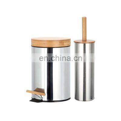Bamboo Lid Trash Bin and Toilet Brush Set Round Shape Pedal Soft Close Silver Stainless Steel