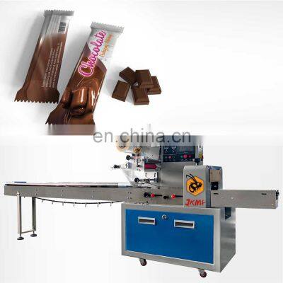 Easy setting automatic chocolate bar foil wrapping packaging machine for chocolate bar pillow packing machineProducts DescriptionThe JK-B model flow packing machine features quick, easy changeover and adjustment that minimizes product and film waste and reduces maintenance costs.The machine working starts with a cylindrical roll of film. The flow wrapping machine will transfer the film from the roll and through to the forming collar (sometimes referred to as tube or plow). At the same time, a conveyor has lined up individual products for wrapping. The film is fed through the collar and the product is surrounded with film, sealed and the film is then cut. The finished individual product is then gathered downstream to be bagged or cartoned prior to boxing and palletizing.Automatic flow packing machine is a widely used packing machine. Suitable for all kinds of product packaging. Including medical supplies, vegetables and meat, baked bread, snacks and candy, daily necessities, hardware accessories, etc.Main Features1.Dual frequency conversion control, Bag length can be set and cut in one step, saving time and film.2.Interface features easy and quick setting and operation.3.Self failure diagnosis, clear failure display.4.High sensitivity photoelectric eye color tracing, numerical input of cutting sealing position for extra accuracy.5.Temperature independent PID control, more suitable for packaging different materials.6.Positioned stop function, without sticking knife or wasting film.7.Simple driving system, reliable working, convenient maintenance.8.All control is realized through software, easy for function adjusting and technical upgrade.Machine Working Process1st step: Put the packaging film on the holder and wear the film as required.2nd step: Setting the parameters you want by touch screen.3rd step:Put the materials to be packed on the conveyor belt4th step: The bag former will make the bag automatically.5th step: The horizontal and vertical cutter device will seal the middleand of the bag.6th step: You will get the nicely paper or plastic bag type.Why Choose UsJIKE BEE MACHINERY has a professional team to provide customers with various packaging solutions. Fully understanding the needs of customers,engineers design the most suitable solution. We have our own processing and assembly workshop and quality inspection and debugging process to ensure the quality of the machine. After acceptance by the customer, they are packed in international standard wooden cases and shipped.We will package the machine's instruction manual and a USB flash drive with machine operation videos together with the machine.Ensure that you can use the machine as soon as you receive it. If you have something you don't understand, our after-sales team will also help you answer in time.Our customers have covered more than 80 countries around the world.And give us unanimous praise.Company ProfileFoshan Jike Bee Automation Equipment Co., Ltd. is a manufacturer of automatic packaging equipment.We are a production-oriented enterprises focused on product innovation, factory direct sales and perfect after-sales service in one.The automatic packaging equipment for granule, powder, liquid and sauce produced by the JKMF company is at the advanced level of the industry,it can be customized production automatic material packaging line for all kinds of products .Mainly applicable to: food, hardware, drugs, daily chemicals, pesticides, fruits and vegetables, cosmetics, other industries.The company has its own patent and product technical certification, which can bring customers high quality equipment and worthy of customer trust.CertificationsFAQQ1:Do you have manual or operation video for us to know more about the machine? Yes, not only manual or operation video, 3D drawing also available to make as per your design,also the video we can make of testing the material from our packaging machine if your packing goods easier for us to find from our local market. Q2:How can I trust you for the first time business ?Please note our above business license and certificate. And if you don't trust us, then we can use Alibaba trade assurance service, guarantee your money, and guarantee your machine's on-time delivery and machine quality.Q3:Is engineer available to serve oversea?Yes, but the travel fee is paid by you. So actually to save your cost, we will send you a video of full details machine installation and assist you till the end.Q4:How can we make sure about the machine quality after we put the order?Before delivery, we will send you the pictures and videos for you to check the quality, and also you can arrange for quality checking by yourself or by your contacts in China.Q5:Will you provides the door to door service?Yes. Please offer us your final destination, we will check with our agent to see if it available, and most of the area is ok for us to clearing and sending in your countries.