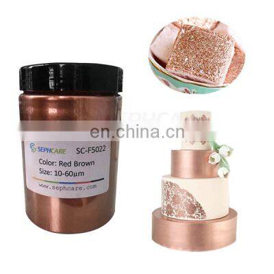 Product DescriptionSephcare Food Ingredient Additive Metallic Luster Dust Edible Glitter Pigment Cake DecorationsSephcare's food grade pearl pigment is make up of natural mica flakes, titanium dioxide and iron oxide. The pearlescent pigments are specially made to meet the food and pharmaceutical industries' high quality requirements. all kinds of luster is coated with iron oxides, and the iron oxide can increase the color absorption rate. And this is how we keep our gold luster so shinny.In order to obtain all kinds of luster effects, what we did, is to maintain a certain amount of thickness of the iron oxides.Item NameEdible metallic food additiveColor Multi colorAppearanceFine powderPH6-11Density2.50-3.40 kg/LParticle size10-60 µmSolubility (in water)InsolubleApplicationFood pigments, leather pigments, coating pigments, cosmetic pigment, ink pigments etc.PaymentTT/Weatern Union/PayPalShippingFedex, By Air, By Sea.Detailed ImagesOur CompanyOur ServiceTo support all the demanding customers, we are going to focus on value addition in order to satisfy the needs of all our customers. The valued-added service spans:1.Special Packings 2.Own Brand Labeled 3.Product Images Support 4.Formulation Guideline Support,etcPacking & DeliveryAll freights are determined based on the weight of the item and the destination. 1.1kg with double plastic container inside/Aluminum foil bag outside. 25kg with double plastic container inside/Fiber drum outside or it is at your option.2.Dispatch goods Usually via DHL and FEDEX, but other kind of shipping ways can be negotiated.3.Delivery Time: 7 days after payment.FAQQ1: How can I place order?A: You can send inquiry to us or start a chat online with me first.Q2: Do you provide samples?A: Yes. Sample pack can be send to you, please tell us your usages, also need your shipping address and post code.Q3:How can I pay for you?A: We accept Online bank payment,T/T and Western Union and Trade Assurance. Before you pay, please contact us for payment details.Q4: Can you do OEM for me?A: Yes, we are good at OEM order, just provide us what you want and we can give the best design.
