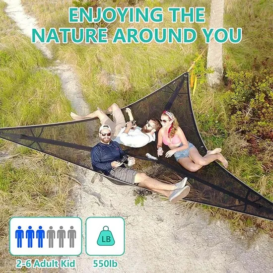This triangle hammock can accommodate 2-6 adults and children, making it ideal for enjoying time outdoors. Made of durable breathable fabric, it can hold up to 550 pounds. Triangle hammocks are easy to install and remove, and can be used in backyards, yards, or even in parks or campgrounds. It also comes with a convenient storage bag for easy storage and transportation.