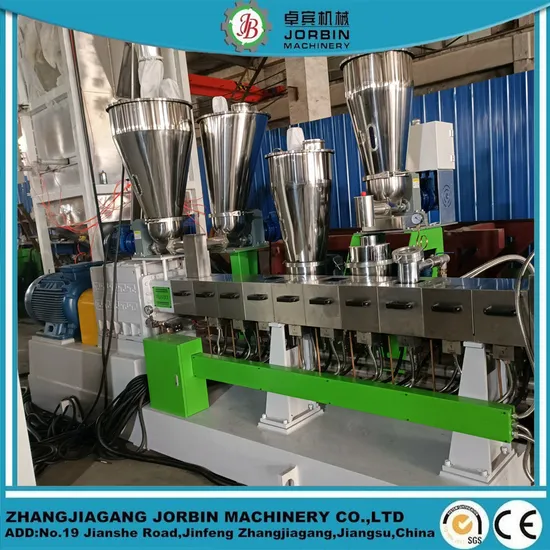 twin screw extrusion granules making machine for PE, PP, TPE and Copolymers such as SBS Color batches Filler and additives compounding extrusion granulator.The machine with High-torque twin-screw extruding screw unit, this is a new-generation high-speed, high-torque and high-power twin screw extruder realizing technological promotion based on the existing product by drawing experience from the advanced manufacturing technology in China. Screw elements install like building blocks, piece by piece. Differ design can be for different material.