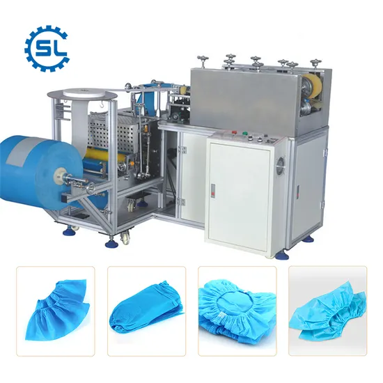 Disposable automatic shoe cover making machine, which can produce non-woven material shoe covers with good quality, low price and high output. It can completely replace manual shoe covers, save labor and reduce costs, and can be customized according to customer requirements.