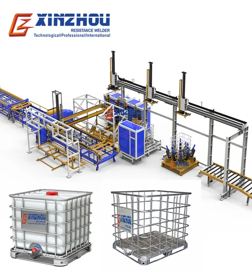IBC tank welding machine Production line equipment IBC tank frame welding machine,bending machine,locking machine,hole punching machine,base frame welding machine the full set of production equipment. Six-Head IBC Frame Automatic Welding Machine The welding power is designed with 4 sets of MF DC power source.It can do 6 spots welding at one time. Double layer fixture feeder.When one fixture is under welding, another fixture can be loaded with material. Flat Tube Mesh and Firm Welding Qualit