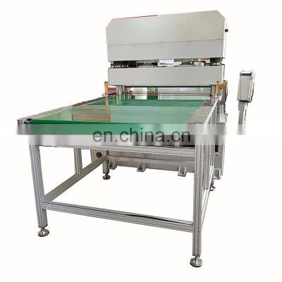 hydraulic die cutting machineThis hydraulic die cutting machine is mainly suitable for die cutting single or multiple layers of nonmetal rolled materials by die cutter. It is widly used in many industries, such as:Automotive interiorSheet material industry suppliesFloor matsAbrasives, abrasive paperLeather and leathergoods – shoe uppers, wallets, purses, beltsLampshades – fabric or plastic, with or without cut outsClothing – components for hats, ties, collars, shoulder padsCork gaskets and matsFilters for machinery, breathing apparatus and the medical industryFoam and sponge – gaskets, packaging, consumer productsFootwear components – shoes, insoles, insole socks, uppers, strapsPlastics – PVC binders, lampshades, stationery products, gifts, novelties, gasketsRubber – gaskets, seals, washers Product DescriptionUsage & Features1. Automatic Cutting Machine is applicable to continuous and large-batch cutting of nonmetal materials such as fabric leather, carpet, rubber, film, foam and cloth etc. in large-scale factories by die cutter.2. Use PLC computer touch screen to control procedures, servo motor driver conveying system, insure feeding accurate range, with stable running speed.3. Can work in fully automatic, semi-automatic, manual mode;4. The main machine is controlled by four-column guiding, double-crank balancing, four-column blocking fine adjustment mechanism and hydraulic control system, which can guarantee the speed and accuracy of die cutting machine. 5. The central automatic lubrication system can guarantee the machine precision and enhance machine durability6. The input and output of materials are conveyed on the conveying belt, and the die cutting of materials is also automatically completed on the conveying belt.7. The unwinding system can be designed based on customer's requirement. Automatic feeding flat bed table supports materials in sheet, and roll unwinding system supports materials in roll;8. The device with cutting board and fixed mold to make the operation more convenient.9. Products of special specifications can be customized.How to choose a cutting machine:Material: Nonmetal material such as leather, fabric, foam, EVA, rubber gasket, etc.Cutting area: it depends on the material size.Cutting force: it depends on the blade perimeter of the die cutter.Feeding system: it depends on the material. Main Technical Data(Customizable) ModelDPMQMaximum cutting force60T100TCutting area1250*800mm1250/1600*1200mmMotor power5.5KW11KWTension Distance25-135mm25-135mmMachine weight7500kg10500kg