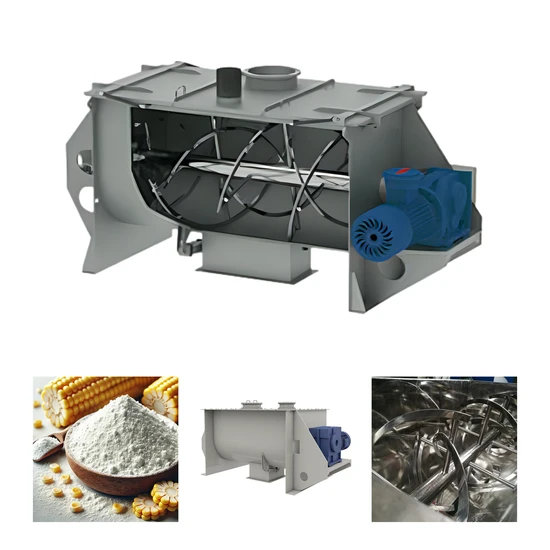 The Horizontal Ribbon Mixer is primarily composed of a robust mixing chamber and an efficient stirrer drive device. Within the U-shaped tubular chamber lies a dual-layered, counter-rotating ribbon spiral agitator shaft. The outer spiral ribbon, powered to perfection, propels materials from the ends of the U-shaped chamber towards the center, while the inner spiral ribbon moves materials from the center towards the ends, orchestrating a dynamic convective mixing effect. The strategically positioned discharge port is centered at the bottom of the horizontal chamber. The ingeniously crafted spiral structure of the outer ribbon, working in harmony with the rotation direction of the main shaft, deftly channels the material within the chamber towards the central discharge port, ensuring an efficient discharge process devoid of dead corners.
