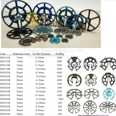 Model/Article No.: wheel style spacer, platform style spacer, safety caps for steel, continuous plastic chair, PVC cone pipe, plastic cone Product Description: Plastic spacer block for protective layer of reinforcing steel bar is designed according to the requirement of national steel concrete construal design norm. It is widely applied in the civil and industrial construction of buildings, roads, bridges, tunnels, airports, subway and so on. Product Character: Having the advantages of high bearing capacity, self locking, crash-proof, good coherence, and easy operation. It is free from the potential quality problems of instable thickness of the protective layer resulting form the use of traditional materials of coprolites and sands. Executive Standards: GBT10-89 Q/SJLX01-2000 Compression Strength: ≥68Mpa Ultimate Load: ≥4.5Mpa What are plastic spacers used for? Plastic spacers are used with reinforcement products. The spacers allow the reinforcement steel to be positioned in the required locations. This can be vertically or horizontally (dependent on type). The space required for mesh and rebar is determined by the requirements of the concrete slab and specification provided by a structural engineer. Why use plastic spacers? Plastic has been found to be one of the most versatile of all building materials. In precast technology it has a major role to play in the maintenance of cover in precast units. It is mandatory to maintain a specific spacing between the reinforcement and the slab face. The variety of precast units has led to a significant array of plasticsolutions being developed, each with characteristics which makes them adapt to specific applications