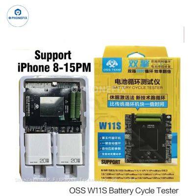 OSS Team W11S dual-channel automatic battery cycle tester is suitable for iPhone 11/11P/11ProMax/12/12Mini/12Pro/12ProMax/13/13Mini/13Pro/13ProMax/14/14Plus/14Pro/14ProMax/15/15Plus/15Pro/15ProMax.