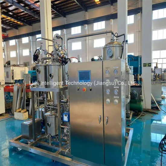 The carbonating mixer is the equipment to mix sugar syrup, water, and carbon dioxide. The product water is degassed and mixed with the syrup in a fixed proportion, cooled to the process temperature through a plate heat exchanger, and then fully mixed with carbon dioxide to complete carbonation.