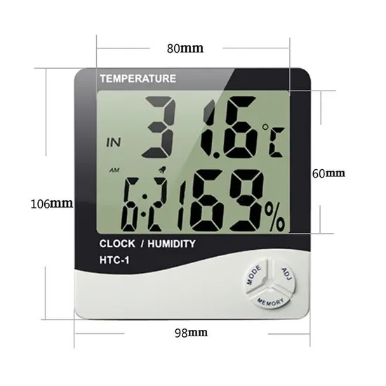 Product Description Product Feature: 1.100% brand new, high quality 2. Small and portable 3. Liquid crystal display: display temperature, humidity and time at the same time 4. Low power consumption, high stability and precision 5. Memory of maximum and minimum measurements, 12 months 24 hours format 6.Centidegree/Fahrenheit optional 7. Integral hour alarm function 8. Positive three buttons can set the time 9. In the rear Fahrenheit transformation, there is a black button inside a small round hole, click to turn the alarm function 10. Clock and calendar functions (month, day) 11. Desktop or wall-mounted Product parameters: Temperature range: -50~+70ºC (-58~+158F) Humidity range: 20%~99%RH Resolution: Temperature: 0.1 C (0.1F), Humidity: 1%RH Accuracy: Temperature: +-1C (1.8F), Humidity: +-5% Relative Humidity (40%~80%) Storage condition: -20ºC~60ºC, 20~80%RH Battery: One AAA battery (not included) if you need it with battery please contact us !! Size: 10cm*10.8cm*2cm Package Included: Thermohygrometer Alarm Clock* 1 English User Manual* 1