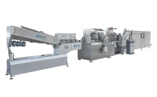 High-speed strange shape lollipop process center is the best equipment for lollypop production. This product has many features, such as reasonable structure, excellent performance, pleasant appearance, solid and durable, safe and dependable and so on. It is made up of sugar inlet device, turning around cutter device, sugar feeding plate device, stick transmitting device, forming and turning around mould device, sugar clamping transmit chain, hot seal packing wheel, cutting device, drive mechanism, and electric box.