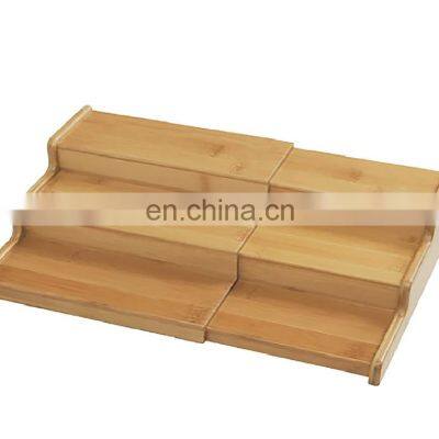 Product Details * Organizer measures (8.75" to 15.5" W) x 8.25"L x 3.3" H * Expandable 3 step organizer designed for storing spice bottles and organizing kitchens, pantries, bathrooms and counter tops * Durable, attractive bamboo construction. Fast-growing and plentiful, bamboo is stronger and more sustainable than hardwood and plastic cabinet organizers; air dry and do not submerge * Steps measure 3 inches deep, providing plenty of room to organize spice jars, cans, sauces, jelly jars, vitamin and medicine bottles in addition to other goods * Use it for more than storing spices: use it as a display shelf for collectibles like Pop! Vinyl toys and other figurines; organize essential oils, store cosmetics like lipstick and nail polish, keep it as a drink rack in the kitchen, or use it as a perfume and cologne rack in the bathroomProduct CategoryCustomized ServingCompany ProfileFAQQ1:Do you have factory?A: We're a reliable factory who has 15 years experiences in manufacutring bamboo&woodtableware and kitchenware.Q2:Do you provide customized service?A: Yes, we are able to customize the size of products and packaging upon your request.Q3:How can I get the samples?A:If you need samples,we can make as per your request .You should pay for the transportation freight and cost for sample,while the samples cost can be refundable after you place the order.Q4:How much the transportation freight of samples?A:The freight depends on total weight and packing size and your area.Q5:How long can I expect to get the sample,lead time ?A:The samples will be ready for delivery in 3~5days.The samples will be sent via express and arrive in 5~7 days. And lead time are 30days or so ,based on order qty. Q6: Where is your loading port?A: Shenzhen, Xiamen or Fuzhou port.Q7: What about your payment term?A:30% T/T,Escrow and Paypal deposit in advance and balance payment upon copy of B/L or L/C at sight.