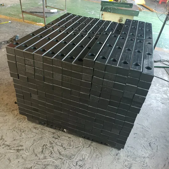 Marine fender pad of UHMW-PE material no swelling or deterioration from water permeation.