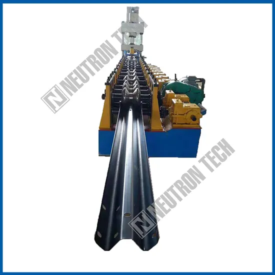 Automatic decoiler - Feeding - Leveling - Punching and cutting - Roll forming - Product packing manually The Structure of Machine Automatic expansion decoiler 1.Double unrolling machine, 2.Adopt automatic expansion system, power 2.2kw 3.Maximum coil weight: 10,000kg, 4.inner diameter: 450-600mm, out diameter max 1900mm 5.with brake system. Feeding & leveling wall plate type 9 rollers leveler, 2 roller feeding, 7 roller leveling. Leveling roller 120mm, material 40Cr, heat treatment HRC48º~52º. Four stand roller to control sheet up and down movement. Power: 11kw, inverter adjusting, speed: 10-25m/min, feeding width max 500mm. Punching and cutting: 1.Use four column type press from Yangli group, equip with punching and cutting die set, fit for 9 or 10 holes. With one set of middle hole punching, cylinder dia 160mm, traveling distance: 60mm 2.Cut to length by encoder: length accuracy 4320±2.0mm, length can set in PLC. 3.Fast feeding unit: after cutting, sheet feeding into roll forming unit, 2.2kw, roller Dia: 120mm, material 40Cr, HRC48º~52º. Roll forming machine 1.Main motor power: 45kw 2.Drive: gearbox driving, 10units, GY230 3.Main shaft diameter: 80mm and 40Cr steel 4.Roller material: GCR15 quenched 58°-62°, chromed 5.Roll station:12 stations 6.Speed: 2-3pieces per minute (4320mm length) Output table Control panel 1.Control system 2.Voltage, frequency, phase: 380v, 50hz, 3phase 3.Automatic length measurement: One-unit tooling of length measuring which is lightly pressed on the surface of the steel sheet; the tolling will roll with the moving speed of the steel sheet and then sense to measure its length. 4.Automatic quantity measurement 5.Computer used to control length & quantity, machine will automatically cut to length and stop when required quantity is achieved 6.Length inaccuracy can be amended easily 7.Control panel: button-type switch, touch screen 8.Unit of length: millimeter 9.Protection function 10.Motor over: Load protection 11.System over: Current protection 12.Short circuit protection e. Additional function Display total length produced Display total quantity produced Display forming speed Product display