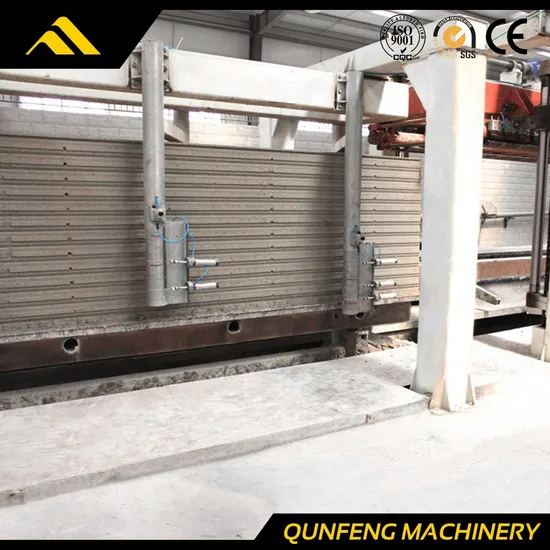 (17)Ferry Cart (18)Turning Crane (19)Vertical Cutting Machine (20)Horizontal Cutting Machine (21)Turning&Grouping Crane (22)Curing Cart (23)Autoclave (24)Finished Product Crane (25)Block Clamping Machine (26)Winch For Side Plate Return Technological process: 1. First, dose and match measured raw materials; 2. After distributing, feed raw material into pouring mixer to make slurry. 3. Through thoroughly mixing, the slurry is poured to mould; , 4. After pre-curing under a certain temperature and time, the block would reach a certain hardness and prepare for cutting; 5. Tilting hoister would turn over 90 degrees of mould; 6. Then open the mould and separate it from block. And take the block with side plate to the cutting cart; 7. Firstly, the cutting machine vertical cuts blocks from both sides. 8. Secondly the horizontal cutting; 9. Finally the vertical cutting; 10. After cutting, the block is hanged to trolley with side plate by semi-finished product hoister; 11. Organizing the cut blocks and put them into autoclaves; 12. Hardening the blocks under certain temperature and pressure; 13. Carry the finished product out of autoclave 14. The finished product hoister take the finished product to stock shield; 15. Packed for loading; 16. The side plate return back through side plate roller; 17. Side plate would be organized with open mould; . 18. Clean the mould and prepare for next pouring; 19. Steel bars processing line for slab production.