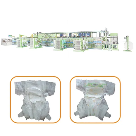The full servo big waist baby diaper making machine adopts servo motor driven,human-computer interface, easy and fast operation, the product model only needs to be adjusted on the touch screen, the amount of cotton paste applied, the amount of polymer applied, and the splicing speed can be set respectively on the operating screen,) raw materials lacking, jointer, splice, fans & vacuum pump jump-off, all display the real-time information and production speed(pcs\min), shift output, rejecting quantity, total capacity, are interface display. The servo drive system can adjust the speed and force of the production line according to the requirements of the product, thus ensuring the quality and stability of the product. The human-machine interface can be manipulated and has many features beyond those listed above. It is used in the manufacture of high-quality baby diapers. The raw materials used in the production of baby diapers are cotton core (mixed with SAP), ADL, PE film, Frontal tape, Topsheet hydrophilic nonwoven, Leg cuff hydrophobic nonwoven, etc.