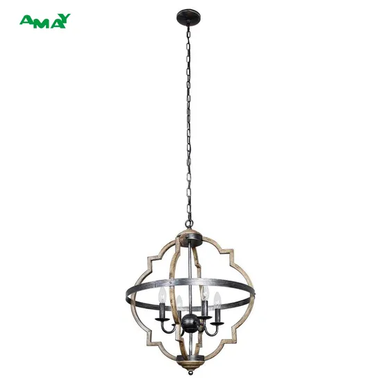 Bring rustic charm to your dining room with this unique Farmhouse Antique Distressed Metal 4-Light Chandelier. The interlocking quatrefoil frames, metal banding, and turned decorative finial make for a striking look, enhanced by the distressed oak finish and candelabra-style fixtures. This chandelier is perfect for those who seek a rustic ambiance.