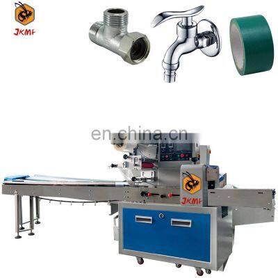Automatic Hardware Part Horizontal Packaging Machine For Water Pipe Elbow Packing Machine Waterproof Tape Faucet Packing MachineMachine IntroductionThe JKMF flow packing machine features quick, easy changeover and adjustment that minimizes product and film waste and reduces maintenance costs.The machine working starts with a cylindrical roll of film. The flow wrapping machine will transfer the film from the roll and through to the forming collar (sometimes referred to as tube or plow). At the same time, a conveyor has lined up individual products for wrapping. The film is fed through the collar and the product is surrounded with film, sealed and the film is then cut. The finished individual product is then gathered downstream to be bagged or cartoned prior to boxing and palletizing.Machine InformationThe packaging speed is fast, the efficiency is high, the packaging process is clean and hygienic, and the operation is simple. Choose the right packaging equipment for your operation and get the highest levels of safety, shelf life, flavor retention, and appearance at every stage of production.The process of automatic bag making, date coding, labeling, weighing, and packaging is completed at one time.ModelJK-250BJK-350BJK-450BJK-600BFilm WidthMax.250 mmMax.350 mmMax.450 mmMax.600 mmBag Length65~330 mm65~330 mm120~450 mm130~600 mmBag Width30~110 mm50~160 mm60~210 mm60~280 mmProduct HeightMax. 40/55 mmMax. 45/80 mmMax. 110 mmMax. 110 mmPacking Speed40~230 bags/min40~230 bags/min30~180 bags/min20~150 bags/minMachine Size(mm)3700*670*14503770*720*14503990*900*14683990*1000*1468Machine Weight450KG500KG550KG800KGMachine Voltage220V, 50/60 HzMachine Power2.4KW2.8KW3.2KW4KWMain Features1.Dual frequency conversion control, Bag length can be set and cut in one step, saving time and film.2.Interface features easy and quick setting and operation.3.Self failure diagnosis, clear failure display.4.High sensitivity photoelectric eye color tracing, numerical input of cutting sealing position for extra accuracy.5.Temperature independent PID control, more suitable for packaging different materials.6.Positioned stop function, without sticking knife or wasting film.7.Simple driving system, reliable working, convenient maintenance.8.All control is realized through software, easy for function adjusting and technical upgrade.Machine DetailsMachine Control CenterThe packaging parameters setting is set on the HMI screen (human machine interface). A pulse is generated for machine movement, and this is transferred to the PLC (programmable logic controller).Including packaging size, packaging speed, etc. Film Holder With Date PrinterWhen the HFFS packaging machine is operating, the film is usually pulled off the roll by film transport belts, which are positioned to the side of the forming tube which is located at the front of the machine. A date printer can be installed on the film holder, so that the production date and other information can be printed on the colleague of the packaging.Replaceable Bag FormerThe film enters a forming tube assembly. As it crests the shoulder (collar) on the forming tube, it is folded around the tube so that the end result is a length of film with the two outer edges of the film overlapping each other. Middle Bag Heat Sealing DeviceThe horizontal seal bar, which is hot, moves forward and makes contact with the horizontal overlap on the film, bonding the layers of film together.Bag Heat Sealing Cutting DeviceA set of heated horizontal sealing jaws come together to make the top seal of one bag and the bottom seal of the next bag. While the sealing jaws are closed, the product that is being packaged is dropped down the middle of the hollow forming tube and filled into the bag.This is a complete packaging process, you will get the perfect packaging finished product.If your product needs to be filled with nitrogen to ensure the freshness of the product, then you need to purchase a set of nitrogen production equipment. In addition, our machines can also be equipped with labeling machines, date coding machines, etc. to meet your production needs.Why Choose UsJIKE BEE MACHINERY has a professional team to provide customers with various packaging solutions. Fully understanding the needs of customers,engineers design the most suitable solution. We have our own processing and assembly workshop and quality inspection and debugging process to ensure the quality of the machine. After acceptance by the customer, they are packed in international standard wooden cases and shipped.The machine has more than 10 advanced patented technologies, CE certificate, ISO9001 certification, etc.We will package the machine's instruction manual and a USB flash drive with machine operation videos together with the machine.Ensure that you can use the machine as soon as you receive it. If you have something you don't understand, our after-sales team will also help you answer in time.Our customers have covered more than 80 countries around the world.And give us unanimous praise.Company ProfileFoshan Jike Bee Automation Equipment Co., Ltd. is a manufacturer of automatic packaging equipment.We are a production-oriented enterprises focused on product innovation, factory direct sales and perfect after-sales service in one. Mainly applicable to: food, hardware, drugs, daily chemicals, pesticides, fruits and vegetables, cosmetics, other industries.The company has its own patent and product technical certification, which can bring customers high quality equipment and worthy of customer trust.FAQQ1:Do you have manual or operation video for us to know more about the machine?Yes, not only manual or operation video, 3D drawing also available to make as per your design,also the video we can make of testing the material from our packaging machine if your packing goods easier for us to find from our local market.Q2:How can I trust you for the first time business ?Please note our above business license and certificate. And if you don't tru