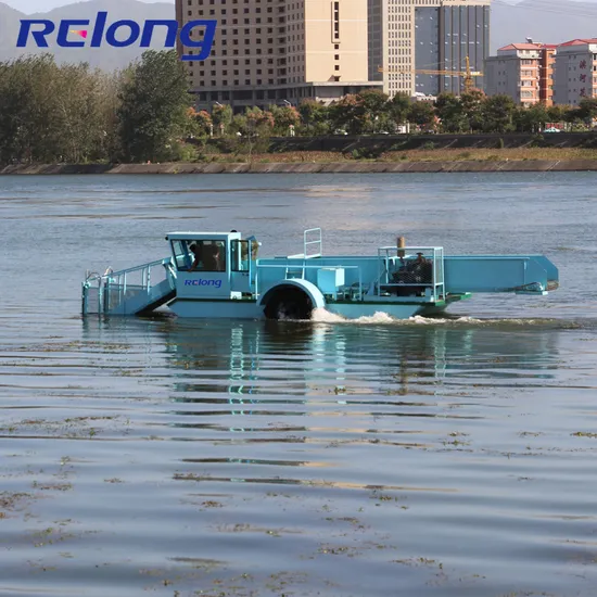 1.Production description:*The aquatic weed harvesters are hydraulically driven with reciprocating knives mounted on the harvesting head to cut the aquatic weed.* The weed is then transferred from the front conveyor through middle conveyor to the storage hold,with the water filtrated during the tranportating.* The storage conveyors are gradually filled up with tightly packed plants and this harvested weed is then transferred to the shoreline or into a dump truck via a shore conveyor. 2.Features: 1) Weed harvester is mainly used to salvage the water hyacinth and alligator weed in rivers and lakes, and it can also collect floating garbages in the water surface.