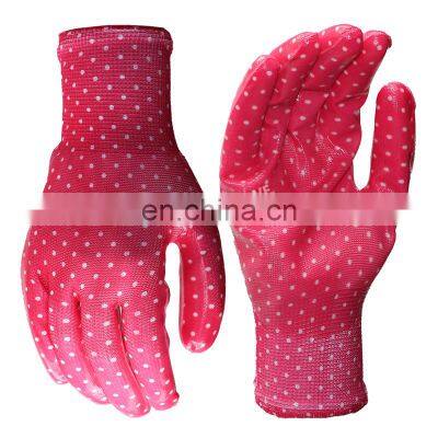 Colorful Polyester Liner Nitrile Coated Gardening Gloves Leather Garden Gloves Gardening Gloves for WomenProduct Description ♥Clear nitrile range offers excellent resistance to abrasion and snags, punctures, grease and oil.♥Colorful nylon liner provides exceptional comfort for the wearer.♥ Knitted wrist for better snug and fit♥ Different cuff color to indicate sizes♥ The glove is anatomically shaped enabling extended wear whilst reducing hand fatigue SpecificationProductColorful Polyester Liner Nitrile Coated Gardening Gloves Leather Garden Gloves Gardening Gloves for WomenMaterial13 gauge polyester linerPalmClear smooth nitrile coatedCuffCustomzied color coded elastic knitted wrist Cut level1Size7''/8''/ 9''/10''/11''ColorGrey/Black/Red/Green/Yellow/Blue or customizedProduct FeaturesExcellent Grip:Clear nitrile coated glove is extremely durable with excellent gripSensitivity:he stretchable polyester liner make it excellent sensitive and perfect fit Comfort:Fits like a second skin, Protects handling products from sweat and dustDurable:Offering good oil resistant and abrasion resistantApplication♣Gardening♣General Maintenance Work♣Assembly Parts&Components♣Light Metal Fabrication♣Warehousing,Shipping&Receiving♣General Handling♣Automotive Manufacturing,Packaging Packaging & Shipping Package10 pairs per polybag, 300 pairs in one carton.Can also according to customers' special requirements.Delivery timeAbout 10 days after receiving depositDelivery methodBy air, air express or By seaShipping portShanghai, Ningbo, Qingdao or any China seaportPayment methodT/T, Trade Assurance, PayPal, Western Union etc Company InformationRelated Products FAQ1. Q:Are you a factory or trading company? A:We are a glove factory(both on the glove liner knitting and PU/Nitrile coating)more than 10 years.2.Q:Where is your factory located? How can I visit there? A:You can fly to Shanghai Airport,we will pick you up in Shanghai to Nantong about 2 hours.Sincerely welcome you visit our factory anytime.3.Q:Do you have CE certificate of your products? A:We are cooperating with CTC, and TUV test labs for many years. Most gloves with CE certificates.4.Q:How can I get some samples? A: Upon we received you samples,we will OEM your sample about 2 days,or we make the sample according to your idea. 5.Q:How does your factory do regarding quality control? Six steps make sure you are buying the qualified goods: Step 1: Raw materials checking,and a trial production before batch producing. (all glove liners will be wear on hand mould to make all our data in glove machine are Mold closing during the trial producing.) Step 2: Skilful workers pick out faulty ones while cutting extra thread; Step 3: Overlocking staff collect faulty glove shell; Step 4:Demoulding worker pick out the faulty ones on Dipping lines. Step 5: Packing staff take out faulty ones when packing; Step 6: QC manager spot check before leaving warehouse.6. Q:Warranty A:We accept customer’s returns if there were quality problem.7. Q:Shipping Service A:We would like book vessel for our customer by our own shipping company;meanwhile we also like to cooperate the customer’s shipping agent to arrange vessel space.
