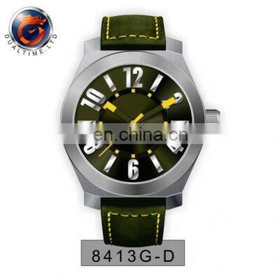 TITEL Buy online shopping big dial wholesale small order high quality china wrist mens watch military [ OEM & ODM ]Product Description Case MaterialStainless SteelCase ColourAny Color AvailableDiameter Size46 MMStrap MaterialLeather bandStrap Width20 MMMovementJanpan Miyota MovementWater resistance10 ATMBrandCustomized Your LOGOLOGO positionCase / Case Back /Dial / Buckle /Crown / BoxesSample Leadtime3-5days for the stock models Production Leadtime30-45 working days More ProductsFor further information about above models, pls contact us!Company InformationHK Dualtime watch industry Co., Ltd is a watch manufacturer build up in 2009 and passes through the certification of ISO9001. The factory area is 1400 square meters, and the annual yield is 500000pcs watches. The company owns a professional research & development team. We can do 300 meter waterproof with good quality. There are more than 2000 watch styles and more than 500 watch samples available, which include lovers series, lady series, sports series, military watch series, gentleman series, electronic series and gemstone series. Most watches are exported to Europe, America, and Southeast Asia. Certifications Packaging & ShippingStandard Package (Free of charge)10 pcs watches inside one foam tray, then 10 trays inside one outer carton. Custom-made Package (with charge)If you have Custom-made package, we can source for you. ShippingMany friends concern about the shipping cost, normally the goods will send out through DHL, UPS, TNT, EMS, FedEx(door to door) if you do not have a domestic forwarder in China. The cost mostly depends on the final choice for the watch models, packing and shipping method, for sure we will recommending the most economic one for you.Our ServicesQuality checking standard:1. All incoming parts and assembled watched will be checked carefully during the whole process.2. All watches will be passed through the waterproof testing.3. All watches can be complied with CE/RoHS, nickel free, etc. 100% safety strap, comfortable, eco-friendly and non toxic to body.Gurantee period:Our gurantee period is one year since the delivery time of mass shipment. During this period, we will take full responsiblilty for all deffective caused by normal using. Either you can send back for repairs, or we send out new parts for your replacement. FAQQ: What is your MOQ? Can i mix colors & styles?A: No MOQ limited for stock watches. Q: Can we have our logo on the watches?A: Yes, you can. Q: Will you provide samples and how much is it?A: sample cost for stock model will be US$50/PC. If need customized logo sample, it will cost US$100/PC. Q: How long is the delivery time of samples and mass order?A: 3-5 days for stock samples without logo, 30-45 working days for mass order if we have enough stock parts. Q: About paymentA: by T.T. If sample order, full payment before shipment. If mass order, 30% deposit after order confirmation, 70% balance beofre mass shipment. For more discounted products, pls contact us as below. Thanks!