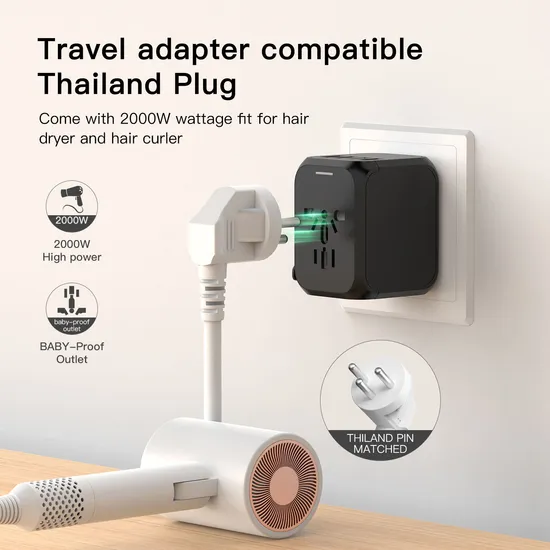5V 3.5A All-in-One Universal Travel Adapter For Europe USA Customized Yes Customized support Software reengineering Place of Origin Guangdong, China Brand Name OEM Model Number SL-309C AC outlets quantity 6 Outlets Network None Type Wall Socket Grounding Standard Grounding USB A output ports 4 ports USB Type-C ports 1 Ports IP level IP46 Use for Charge for Mobile Phone,PAD,Power Bank etc. Product name 4-USB PORTS Fireproof Universal Travel Adapter Keywords Worldwide/Fireproof/4 USB Type-C Material ABS+PC Compliant CE FCC ROHS Application Mobile Phone Tablet MP3 GPS Warranty 12 Months Item Size 52X50MM Plug Option EU US AU UK OEM/ODM YES