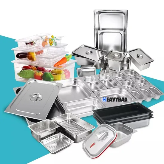 Multiple container size options,including: GN 1/1,GN 2/3 ,GN 1/2,GN 1/3,GN 2/4,GN 1/4,GN 1/6,GN 1/9. Height:20mm, 40mm, 65mm, 100mm, 150mm, 200mm