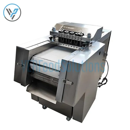 Frozen chicken cube cutting dicing machine is suitable for processing bone frozen whole chicken, duck, pork ribs, chicken legs, frozen meat, pig trotter etc. With continuous PP material belt conveyor, frozen chicken cube cutting machine can process 500-600kg frozen meat per hour, cutting width and length also can be customized according to specific demand. With high efficiency, no consumption features,frozen meat cube cutting machine is widely used in large, medium or small meat processing plant, collective canteens, slaughterhouses,supermarkets, restaurants.