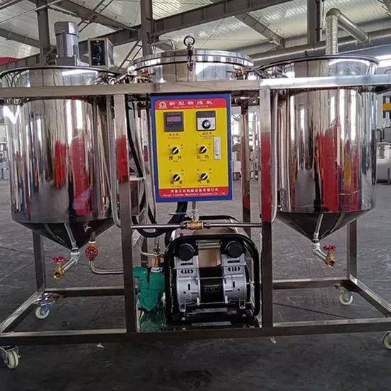 It's made of stainless steel, can realize the dephosphorization, decolorization and drying for crude oil. It is the most economical equipment for mini refining, the process temperature is controlled by user, all are displayed by instrument, the operation is simple and safe. Supplementary materials are controlled by special devices. The refined oil is good, clear and bright, no colloid precipitation, and it does not foam when cooking. It can be bottled directly for sales.