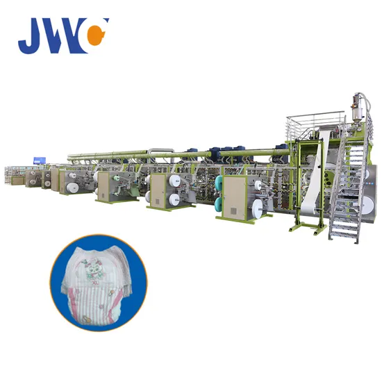 | 1.Machine frame Reasonably solid square steel frame 2. Crusher system 3. Fluff forming system 4. SAP feeding system 5. Bottom tissue feeding, roll diameter φ800mm 6. Upper tissue, roll diameter φ800mm 7. Fluff core wrapped by upper and bottom tissue, also can be wrapped by one whole piece tissue 8. ADL feeding, roll diameter φ800mm 9. Fluff core inner cut device 1 set,adopt frame type structure, increase the cutter life 10. Leak cuff unit 11. Hydrophilic nonwoven supply, roll diameterφ800mm 12. Three pieces complex, two sides fixing unit, adhesion pressing 13. Bottom film supply 14. Surface layer, absorption core, bottom film pressing 15. One set products cutting unit 16. Inner waist nonwoven supply 17. outer waist nonwoven unwinding, roll dia 800mm | 18.waist fluff part licra cut unit, in case this part gets wrinkled. 19.waist middle slitting, web guide after slitting 20.core turns into horizontal direction, 21.core combines with waist material 22.waist nonwoven side folding 23.product vertical folding, pressing and transmission ,web guide before circular welding 24.Z tape: passive unwinding, pulling, absorption transmission, short cut, combine. 25.device on circular welding two sides(heated). This device is controlled by servo motor. It works by heat pressing based on material features. It adopts the most advanced circular welding device to ensure the production high speed running. This part material needs to be confirmed. 26.final cut unit 27.products turn into 90 degree horizontal direction 28. Duel auto rejection exits |