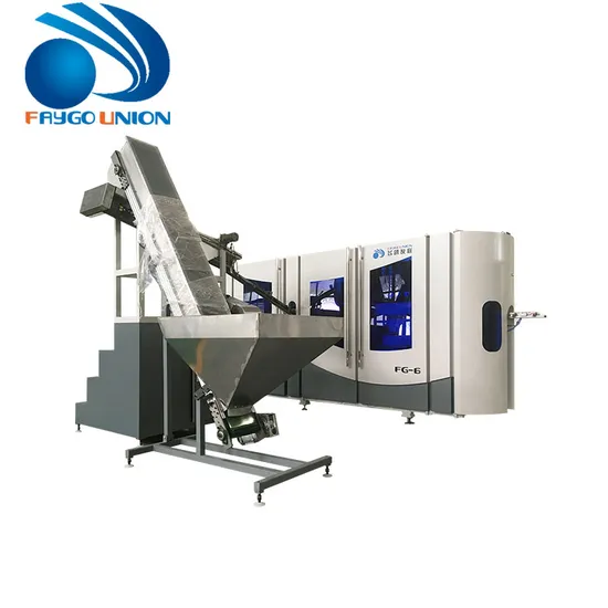 FG series blowing machine are equipped with automatic perform loading and unloading system. The machine is applicable for all shapes of drinking water bottles, carbonated bottles and hot filling bottles.FG-4 is composed of three modules: prefrom elevator, perform unscrambler and host machine.