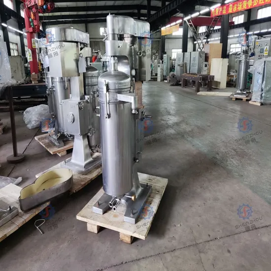 Product Description Shenzhou High speed GQY125 Swing Type Fermentation broth Tubular Centrifuge Separator with Cooling function Swing tubular centrifuge The Swing tubular centrifuge consists of several components including the body frame, body column, head assembly, liquid collection tray assembly, rotating tube assembly, lower sliding bearing assembly, rotating mechanism assembly, and motor drive assembly. To operate, the motor transmits power via the transmission belt and pressure pulley to the small pulley and main shaft on the machine head, driving the rotating bowl to spin at high speed. Feed liquid is then injected into the bowl from the bottom feed port where it is forced to separate into different layers under the strong centrifugal force. The lighter liquid in the center of the bowl flows upward and is collected through the liquid collecting tray, while the heavier solid is thrown onto the inner wall of the bowl. To clean the equipment, the machine must be stopped and the protective screw sleeve must be loosened, then removed along with the opening protective sleeve. The connecting nut on the bowl is unscrewed and the positioning screw and nut are loosened and removed. After this, the handle on the body is rotated to make the body lie on the column of the machine, place the rotating bowl on the operating platform, and remove the solid from the inner wall of the bowl. High-speed tubular centrifuges are ideal for liquid-solid separation in industries like bacterial recovery, blood products, plant extraction, health food, beverages, and chemical industries. They are particularly useful for materials with small liquid-solid weight difference, large viscosity, fine solid particle size, low content, and strong material corrosion. Overall, high-speed tubular centrifuges are one of the best options for material separation via centrifugal methods.